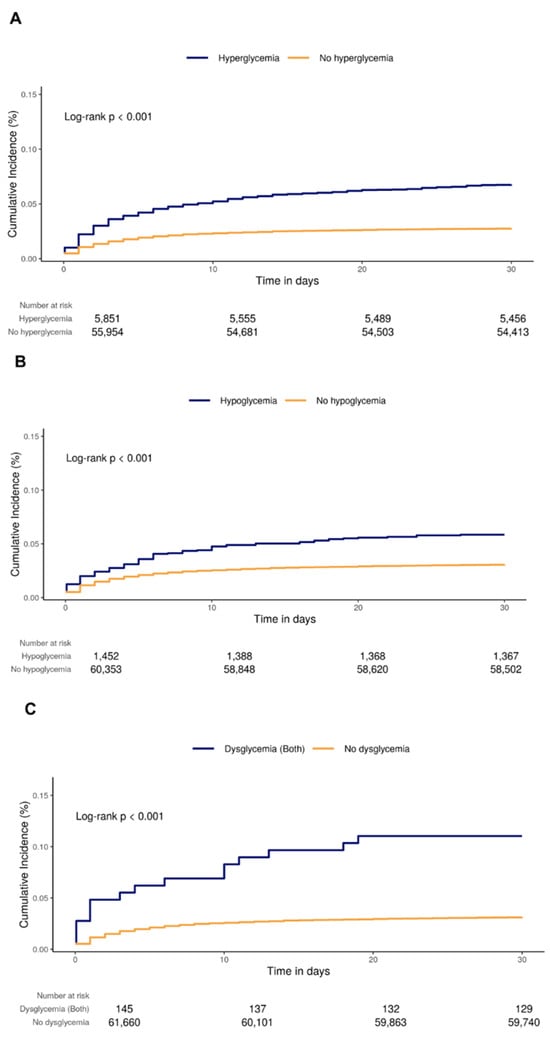 Kaplan–Meier curves of delirium according to exposure to (A) hyperglycemia, (B) hypoglycemia, and (C) both.