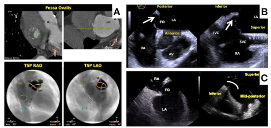 (A): CT planning for optimized transeptal puncture in superoinferior and antero-posterior planes; (B): transeptal puncture with TEE imaging; (C): transeptal puncture with ICE imaging.