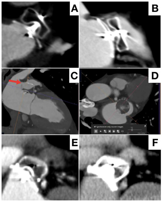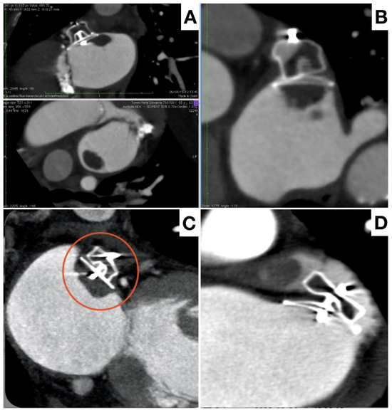 The incidence of DRT is reported around 3% to 4%, but with significant variation associated with the imaging modality used, timing of follow-up and number of scans performed. Multiple studies have documented an association between DRT and ischemic events [71,72,73]. Nevertheless, the management of DRT is challenged by a lack of reproducible diagnostic criteria and optimal detection protocols. Despite TEE offering higher temporal resolution, cardiac CT has superior spatial resolution, is isotropic by nature with three-dimensional (3D) and multiplanar capabilities and is less operator-dependent. CCT seems more sensitive for DRT detection and may give information about its exact position and size, as well as on its base of implant and stability (Figure 7).
