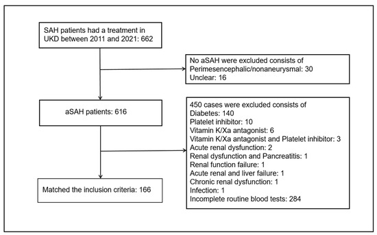 We retrospectively analyzed 662 patients with SAH, who had been hospitalized within 48 h and underwent laboratory examination in the Department of Neurosurgery of the Medical Faculty and University Hospital Düsseldorf from January 2011 to October 2021 and were diagnosed with a computed tomography (CT) scan. The clinical data including patient demographics (e.g., age, sex) and medical history (e.g., hypertension, diabetes, etc.) from these patients were collected via medical records and/or outpatient follow-up. The inclusion criteria for enrollment were as follows: (1) age above 18 years, (2) hospitalized within 48 h in the emergency unit, (3) detected SAH by CT scan, and the diagnosis of the aSAH was achieved by CTA or DSA. The study exclusion criteria were as follows: (1) no aneurysms detected by CTA or DSA, (2) patients without complete clinical data and laboratory examination, (3) having complications with infection, immune dysfunction, blood system diseases, organ function damage, or major infectious diseases, which had significantly influenced the laboratory examination. Forty-six patients were excluded because in them SAH was not caused by aSAH, consisting of 30 cases with perimesencephalic/nonaneurysmal and 16 cases that were unclear. Furthermore, 140 patients were diagnosed with diabetes, 10 cases took the platelet inhibitor, six cases had the vitamin K/Xa antagonist, three cases took the vitamin K/Xa antagonist and platelet inhibitor together, two cases were diagnosed with acute renal dysfunction, one case with renal dysfunction and pancreatitis, one case with renal function failure, one case with acute renal and liver failure, one case with chronic renal dysfunction, and one case with infection that could have significantly influenced the peripheral serum biomarkers; 284 cases with no data on the admission lymphocyte count were excluded. Finally, 166 patients aged above 18 years (ranging from 21.00 to 84.00 years) met the inclusion criteria and were enrolled in our study (Figure 1). The strict inclusion/exclusion criteria and the use of standardized data collection procedures minimized the impact of selection bias and information bias. All 166 patients had complete data. The study was reported in accordance with the STROBE (Strengthening the Reporting of Observational Studies in Epidemiology) reporting guidelines.