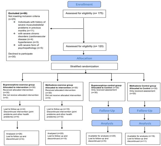 This is a randomized controlled trial conducted in adult patients, men and women, with OUDs. The recruitment, inclusion, and stratified randomization flow diagram for the patients that volunteered to participate in this study is shown in Figure 1. One hundred and seventy-five (175) patients were recruited by the Greek Organization Against Drugs (OKANA), a treatment center of the Attica Region, between October and December 2021. The inclusion criteria were the following: (1) patients with OUDs based on the criteria of the Diagnostic and Statistical Manual of Mental Disorders (DSM-5) [47]; (2) patients coming from the OKANA stabilization phase, in which the surrogate dose had stabilized, with no pronounced withdrawal symptoms between administrations, and where the craving had been significantly reduced so as not to affect the functionality of the individual; (3) newcomers over 3 months in treatment; and (4) patients over 20 years of age. This study was implemented within the structures of OKANA, supervised by a specialized provider of health services for opioid-dependent patients, ensuring (a) an accessible location and sufficient space for exercise and the safety of the natural environment (equipment for managing an overdose or, in rare cases, aggressive behavior on the premises); (b) access to the medical records of patients in cooperation with the Heads of the Therapeutic Structures of the Organization, the facilitation for recruiting volunteers and supervising them in the exercise training program, the assessment of diagnoses, therapeutic histories, social and psychiatric status, as well as a completely updated record of the history/file of each patient participating in this research. Supervision of the exercise program is important for its efficiency, as it results in higher increases of the overall physical condition of the beneficiaries compared to unsupervised programs. Support and commitment from staff and exercise instructors have been shown to motivate adherence and participation and reduce dropout rates [30]. Moreover, supervised exercise training appears to be superior for a dependent population, as it is more effective and provides greater safety than unsupervised exercise [48].