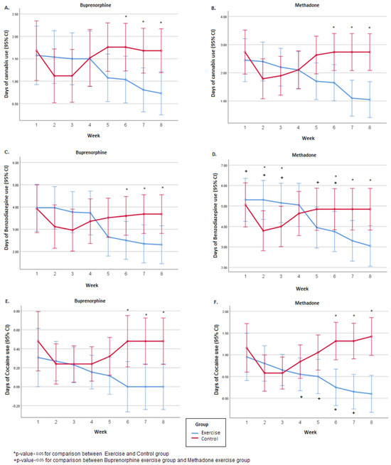 In both substitutes, the number of days the patients had used COC did not differ between the exercise and control groups during the first 5 weeks. In contrast, over the next 3 weeks, the patients in the control group used significantly more COC (Figure 2). For the total days of COC use in the methadone group, the control group had significantly more days of COC use compared to the exercise group (p = 0.037). In the buprenorphine group, no significant difference was found between the exercise and the control group regarding the total number of days that the patients used COC (p > 0.05). Overall, over the course of the 8 weeks of the experimental period, the number of days the patients used COC changed significantly, regardless of the substitute (F(7.343) = 2.12, p = 0.033 for the buprenorphine group and F(7.259) = 3.32, p = 0.002 for the methadone group). Also, the degree of change was different between the exercise and the control group (F(7.343) = 7.24, p < 0.001 for the buprenorphine group and F(7.259) = 16.89, p < 0.001 for the methadone group). Sex and age effects were investigated through the repeated measurements model, and no significant differences were found (p > 0.05). Specifically, in the exercise groups, there was a decrease, and in the control groups, an increase. Also, no significant difference was found between the buprenorphine exercise group and the methadone exercise group regarding the total number of days that the patients used COC (p > 0.05) (Table 3).