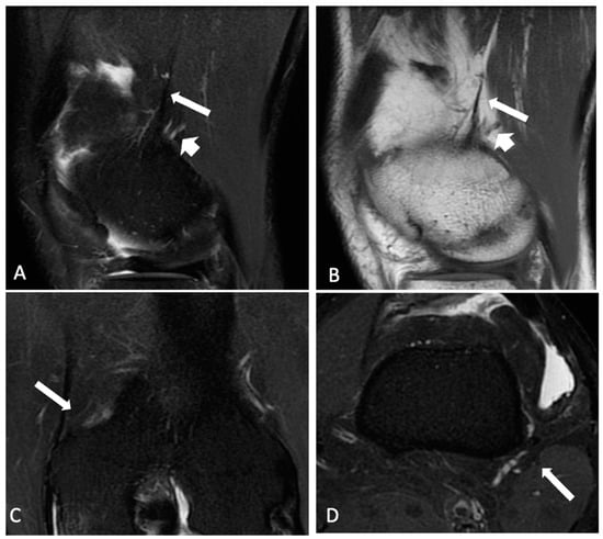 Intact Kaplan fibers. Knee MR sagittal T2FS (A), sagittal T1 (B), coronal T2FS (C) and axial T2FS (D) showing intact distal Kaplan fibers (long arrow) and geniculate arteries (short arrow).