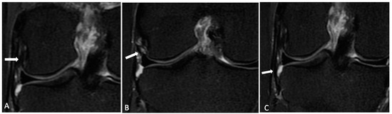 Noncontrast MRIs were obtained using identical protocols. The knees were examined using a 1.5 T scanner (Signa Excite HD; GE Healthcare, Waukesha, WI, USA) with a dedicated knee coil (HD T/R 8-channel high-resolution knee array). The patients were placed in a supine position with their knees extended. The imaging sequences used were multiplane fast spin echo imaging optimized for anatomic detail with the following parameters: repetition time 4000–6000 ms, echo time 25–30 ms, echo train length 8–16, receiver bandwidth 32–62.5 kHz, and an acquisition matrix of 512. 3 (256 to 416). The imaging protocol for this study encompassed a comprehensive approach, incorporating T2-weighted images with fat saturation across the axial, coronal, and sagittal planes. Additionally, T2-weighted sagittal images without fat saturation and coronal T1 images without fat saturation were included in the imaging regimen. The sequences were meticulously acquired with a uniform thickness of 3.5 mm and a spacing of 0.3 mm, ensuring a detailed and high-resolution examination.