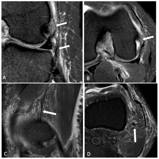 A 28-year-old patient with a partial tear of the anterolateral ligament and intact Kaplan fibers. Knee MR coronal and axial T2FS (arrows in (A,B)) showing edema and irregularity of the ALL (arrows), without discontinuity. Sagittal and axial T2FS images (arrows in (C,D)) showing intact Kaplan fibers (arrows in (B,C)).