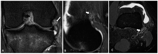The normal ALL was identified as a low-signal-intensity band that originated from the lateral femoral epicondyle, bifurcated above the inferior lateral geniculate vessels, and distally inserted into the body of the lateral meniscus and the lateral tibial plateau. KFs were identified with the distal fiber bundles near the branches of the superior genicular artery and the proximal bundles at the lateral ridge of the distal femur [9]. Each radiologist categorized both the ALL and KFs as intact (Figure 1 and Figure 2), partially injured (Figure 3), or completely injured (Figure 4), based on a previous publication [11]. Intact ligaments were characterized as a continuous clearly defined low-signal band. Injuries were considered in any portion of the structure. Partial injuries included patients with signal changes and edema of the fibers of the ligaments, as well as thinning or irregularity of the anterolateral structures, without a clear fiber discontinuity; complete injuries were characterized by a complete disruption of fibers or no clear continuity in any segment.