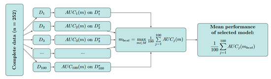 The mean performance of the selected model is expressed by the mean AUC across all test cohorts . For additional validation and to quantify the performance of the model selection algorithm, we applied the resampling approach described above in a nested manner (see Figure 2) [9]. For this purpose, we randomly divided the complete cohort into 100 derivation cohorts (denoted by, each containing 80% of the data) and applied the resampling approach described in Figure 1 to each of the 100 derivation cohorts. For each, the best-performing model was selected by maximizing the mean AUC across all 100 validation cohorts (denoted by in Figure 2, each containing 20% of the data) and the mean AUC of the best-performing model on the validation cohort , denoted by was calculated. The mean [min, max] of the was used as the performance measure of the model selection algorithm.