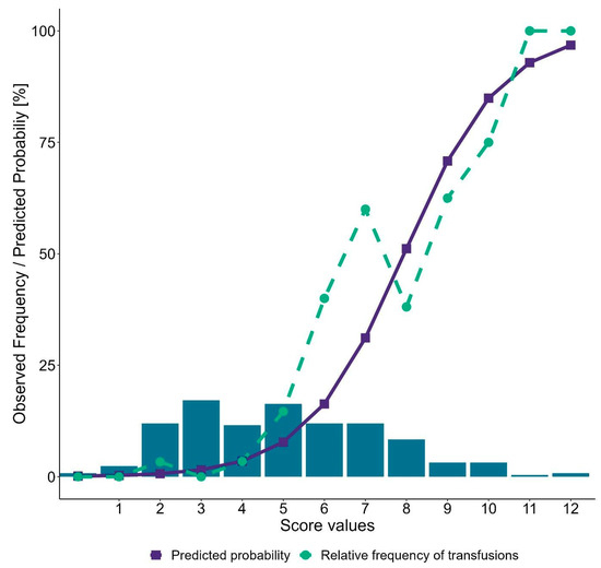 Relative frequencies of score values in the complete cohort (n = 251) (green bars) and estimated probability of RBC transfusions (blue line). The dashed green line represents the observed frequency of RBC transfusions in the subgroups of patients reaching the respective score according to the scoring system.