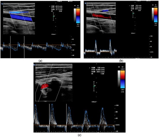 Colour and pulsed Doppler ultrasound on vascular Doppler ultrasound images. (a) Pre-critical left internal carotid artery with complete carotid flight. (b) Post-critical left internal carotid artery with intermittent carotid flight. (c) Post-critical left vertebral artery with intermittent carotid flight.