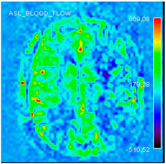 Left cerebral perfusion asymmetry in an MRI perfusion sequence—ASL mapping (arterial spin labelling).