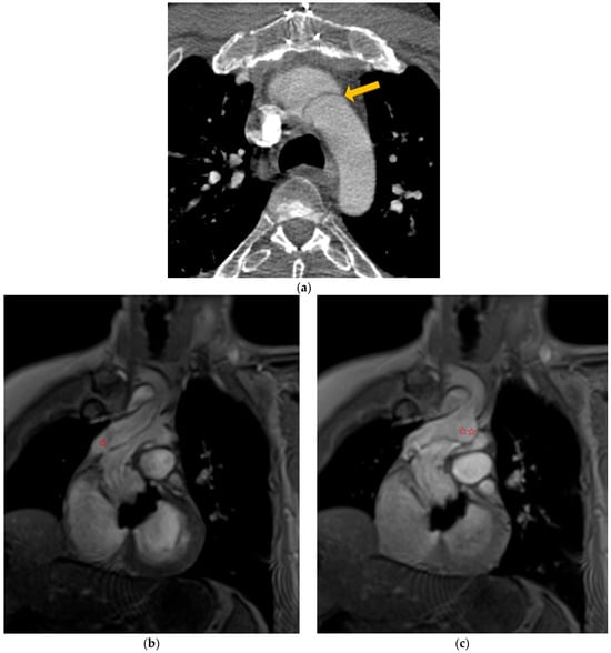 Computed tomography angiography (yellow arrow shows residual intimal flap (a) and flow MRI (b,c) showing a tear in the residual flap (✩) leading to a picture of transient obstruction of the aortic arch; MIR reconstruction (✩✩)—video on annexe.
