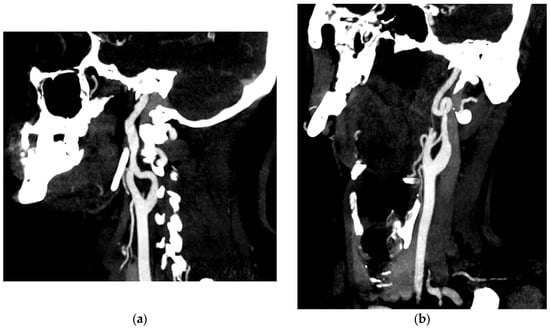 Angioscan of the supra-aortic trunks showing an irregular appearance of the right internal carotid artery (a) and a complete loop of the left internal carotid artery (b) in its pre-petrous portion.
