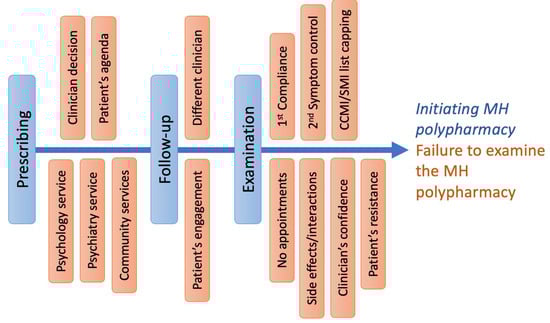 Fishbone diagram illustrating the factors that contribute to the initiation of psychiatric polypharmacy and failures to address inappropriate polypharmacy through rationalisation and deprescription. Critical decision points are also displayed, ranging from the initial prescription decision influenced by both clinician-led and patient-specific factors to the follow-up procedures that may involve multiple clinicians. This model underscores the multifaceted nature of deprescribing, highlighting areas where inappropriate prescribing may take place. Failure at these points leads to inappropriate polypharmacy.