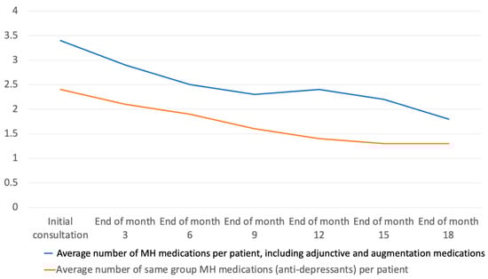 Average (mean) number of psychiatric medications per patient at specified time points during the 18-month period of the project.