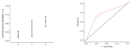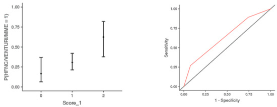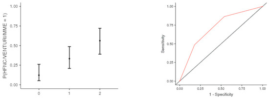 The optimal cut off point was 3.2 for CRP (AUC: 0.740; sens: 0.702; spec 0.705), 0.231 for LNR (AUC: 0.367; sens: 0.46; spec 0.46), 0.90 for dv-NLR (AUC: 0.678; sens: 0.594; spec 0.60) and 0.004 for CLR (AUC: 0.742; sens: 0.65; spec 0.731) (Table 5). As far as the C-CRP #1 score is concerned, two points of C-CRP #1 with an AUC of 0.640 (sens: 0.923; spec 0.270) (Figure 1)) predicted the use of HFNC with a probability as high as 0.625 (p = 0.005). However, 1 point of C-CRP #1 did not exhibit any prognostic value at all for escalation of respiratory support with HFNC. As for C-CRP #3, 2 points of C-CRP #3 with an AUC of 0.715 (sens: 0.622, spec 0.769) (Figure 2) predicted the use of HFNC with a probability as high as 0.561 (p < 0.001). One point of C-CRP #3 did not exhibit any prognostic value for HFNC use. On the other hand, both 1 and 2 points of C-CRP #2 predicted the need for HFNC. One point of C-CRP #2 with an AUC of 0.717 (sens: 0.821; spec 0.486; p = 0.027) and 2 points of C-CRP #2 (p < 0.001) predicted the need for HFNC with a probability of 0.333 and 0.562, respectively (Figure 3).
