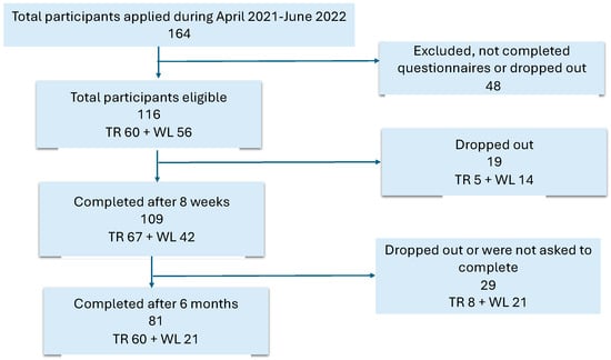 Participants were recruited via Facebook sites and stakeholder organizations for post-COVID-19 syndrome in Sweden (i.e., Svenska Covidföreningen). An online announcement was published alongside a further link for detailed information. All participants who signed an agreement, filled in questionnaires, and performed physical tests with a pulsoximeter, were included in the randomization, as performed by an Internet program at RANDOM.ORG., accessed on 5 May 2021, 27 August 2021 and 28 April 2022. Thereafter, the participants were informed by an email regarding the results of the randomization and were asked again to confirm their participation in the study. The waiting list controls were informed that they would be offered telerehabilitation in the next round. Inclusion criteria were as follows: (a) COVID-19 infection supported by medical history and/or positive tests for the COVID-19 virus (PCR) and/or a positive immunoglobulin response; (b) age between 18 and 70; (c) significantly reduced level (at least 50%) of functioning and activity/participation in daily life after infection; (d) persistent symptom duration at least 12 weeks after acute infection; (e) medically assessed participants with satisfactorily managed comorbidities or new postinfection symptoms; (f) the ability to use the Internet, complete Internet-based questionnaires, and participate in a rehabilitation program delivered through “Teams” (Microsoft program) for a group comprising a maximum of 25 participants over an 8-week period. Exclusion criteria were as follows: (a) unclear onset of symptoms in relation to COVID-19 (for example, stress factors, post-traumatic stress disorder, other types of psychological and somatic trauma in combination with a COVID-19 infection or before it); (b) abuse of alcohol or psychotropic substances; (c) diagnoses of psychological or somatic conditions that are unstable and require appropriate treatment (e.g., hypothyroidism, lung, heart, kidney diseases, psychosis, suicidality, etc.); (d) ongoing psychological and medical treatments that may interfere with the rehabilitation (for example, other psychotherapies or adjustment of pharmacological drugs).