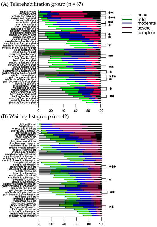 The most impaired functions in the study cohort were neurocognitive/mental functions (fatigability, energy and drive, concentration, short/long-term memory, and sleep), muscular (muscular endurance and muscle strength), breathing, heart functions, and pain-related categories (pain in body at one site and pain in body at multiple sites); see Figure 2. No significant differences were obtained between the groups at the start, except for a tendency to experience more impaired sleep among those on the waiting list (p = 0.056, Mann–Whitney U test). In both groups, breathing functions were found to be significantly improved from a median score of two to one after eight weeks. Participants on the waiting list scored more improvements in breathing functions as compared to those in the telerehabilitation group (Mann–Whitney test, p = 0.034). Apart from breathing functions, the following improvements were obtained within the groups for both groups: sexual functions and pain body at multiple sites (Figure 2). For the telerehabilitation group, additional improvements were obtained in cognitive/mental functions, such as fatigability, energy and drive, concentration, short memory, muscle endurance and strength, mobility of joint functions, gastrointestinal functions, pain in the body at one site, widespread pain, and smell (Figure 2A). For the waiting list, an additional improvement was obtained in body temperature (Figure 2B), while in the telerehabilitation group, there was a strong tendency for improvement (p = 0.051).