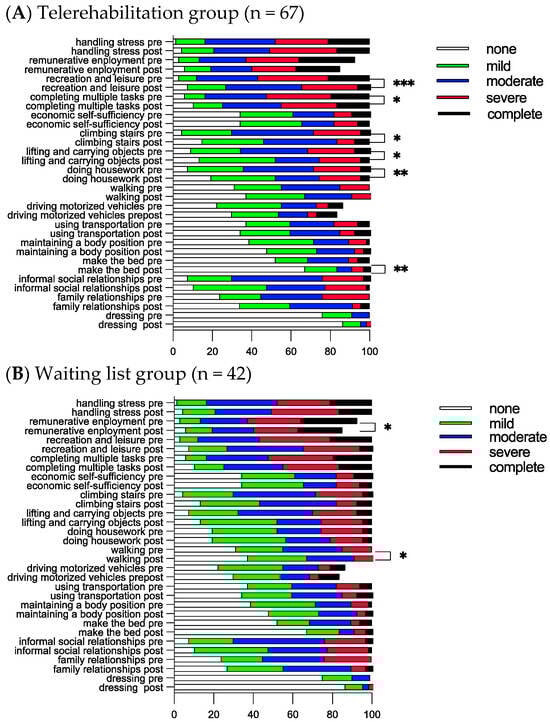 For activities and participation, there was no significant difference between the groups. The telerehabilitation group scored significant improvements in remunerative employment, recreation and leisure, completing multiple tasks, climbing stairs, lifting and carrying objects, doing housework, walking, making the bed, and family relationships (Figure 4B). The waiting list scored significant improvements in handling stress and other psychological demands (Figure 4B), while the telerehabilitation group had a tendency for improvement in this category (Mann–Whitney test, p = 0.072).