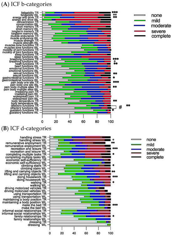 Twenty-two ICF b-categories and sixteen d-categories are presented as frequencies in telerehabilitation (TR) and on the waiting list (WL) at 6 months follow-up. * Indicates significant differences within the telerehabilitation group (n = 60), ° within the waiting list (n = 21), and # between the groups. A nonparametric Friedman test within the groups and Mann–Whitney test between the groups were used. * p < 0.05, ** p < 0.001, and *** p < 0.001; ° p < 0.05; °° p < 0.01 and # p < 0.05.