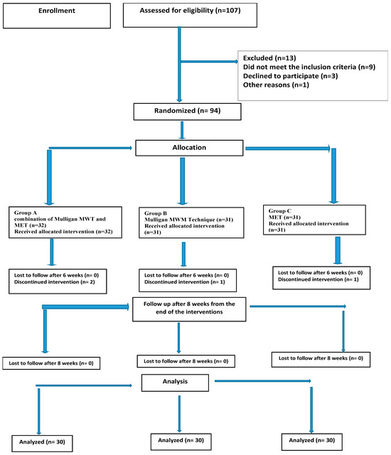 The participants were randomized into one of three groups: Group A received a combination of the Mulligan MWM and MET, Group B received the Mulligan MWM techniques, and Group C received the MET. Experienced physiotherapists delivered the interventions for six weeks, with three sessions per week for all groups.