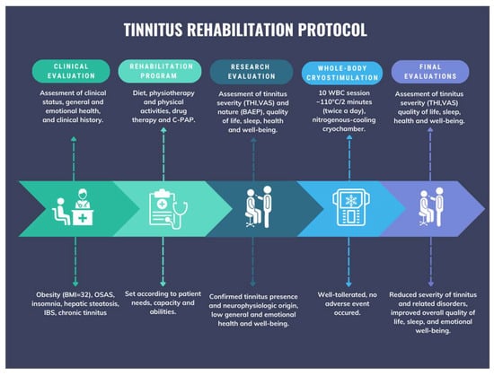 These findings suggest that WBC could serve as a supplementary treatment for tinnitus sufferers by not only restoring nervous system homeostasis but also reducing systemic inflammation and ameliorating tinnitus-associated conditions. To the best of our knowledge, there is only one previous study, which was conducted in Poland, on the effects of WBC on tinnitus. It showed that WBC was effective in reducing the severity of tinnitus for the majority of the study participants and, in some cases, resulted in complete resolution [23]. The purpose of this work is to provide additional evidence of the potentially positive effects of a multi-approach series of rehabilitation interventions that includes a WBC cycle in the treatment of neurophysiologic tinnitus while also evaluating tinnitus-associated conditions, such as overall quality of life, sleep quality, and emotional wellbeing.
