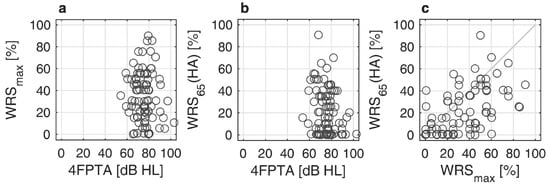 Figure 1a,b relate the pure-tone thresholds to WRSmax and WRS65(HA). Figure 1c relates both word recognition scores in quiet. About 80% of the CI recipients had a preoperative 4FPTA of 80 dB or less (better). About 9% (8 of 87) of the recipients had a WRSmax higher than 60%. However, as illustrated in Figure 1c, these patients were not able to fully utilize this potential information-carrying capacity [9] with HA.