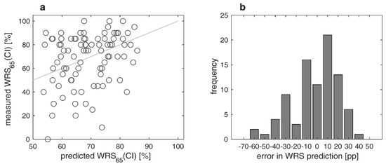 With respect to both the preoperative CI candidacy assessment [16] and the achieved postoperative results, our findings are consistent with those of other studies [7,8,17,18,29]. Overall, the measured WRS65(CI) correspond to the predicted WRS65(CI) with a MAE of 13.5 percentage points. Our retrospective study confirms the results of Hoppe et al. [17], who reported a MAE of 13.5 percentage points as well.
