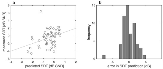 Figure 4a,b show the differences between measured and predicted SRTs. The largest difference was 7.6 dB. In a third of the recipients (34%), the test was not performed. The MAE was 1.3 dB. The prediction covers a range of 3.3 dB (−2.4 to 0.9 dB), while the measured SRTs differ between −4.6 and +6.4 dB.