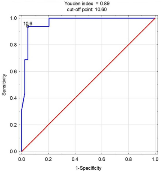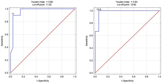 The Youden index, based on the ROC curve sensitivity and specificity values, allows for the determination of the optimal cut-off point [36].