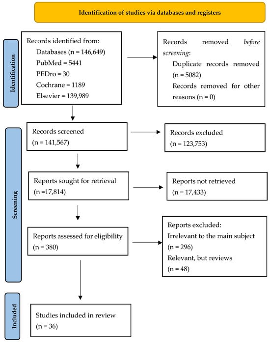 The general search revealed 146,649 articles: 5441 in PubMed, 30 in PEDro, 1189 in Cochrane and 139,989 in Elsevier. We found 508 duplicate records. A total of 123,753 studies were excluded after screening the titles and the abstracts. From the remaining 380 papers, a selection was made and only the papers related to the subject were chosen, resulting in the selection of 84 articles, including reviews. After removing the reviews, a total of 36 articles were analyzed (Figure 1).