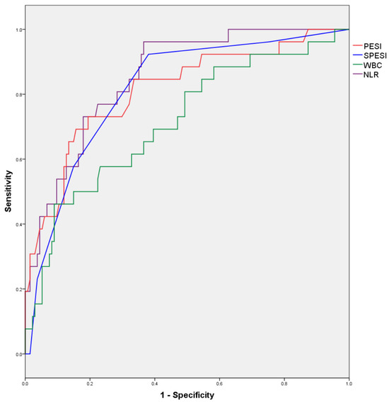 - A group of 4 patients without COVID-19 who had a WBC count up to 18.975 × 103/µL and an NLR up to 14.525 but presented a PESI score above 189. In this group, the predicted chance of in-hospital mortality was 75%.