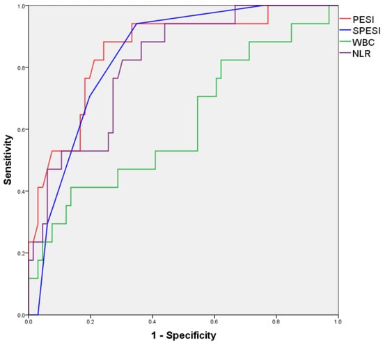 A subanalysis of the group with a CBC available in the first 24 h after PE diagnosis was also performed; however, an adequate binary logistic regression model for predicting in-hospital mortality could not be obtained. ROC curves for numerical variables found to correlate with in-hospital mortality in bivariate analysis are illustrated in Figure 2 and the areas under the resulting ROC curves are presented in Table 10.