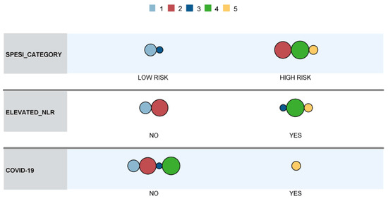 Cluster 5, with the highest mortality, was exclusively comprised of COVID-19 patients, who were classified into the high-risk sPESI category and had elevated NLR. Clusters 1–4 were mainly composed of non-COVID-19 patients (a single case in cluster 3). Cluster 4 contained patients classified into the high-risk sPESI category, which had elevated NLR, while patients in cluster 1 (which showed the lowest in-hospital mortality) were categorized as low risk according to the sPESI score and did not have elevated NLR values. Cluster 2 contained patients classified as high risk according to sPESI score without having elevated NLR values, while Cluster 3 was comprised of patients categorized as low-risk according to sPESI score but who had elevated NLR values.