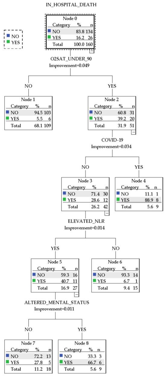 In this study, CART models were computed in pruning mode, considering variables that correlated with in-hospital mortality. To grow the decision tree model, we allowed for automatic selection of maximum growth levels (5 by default), with 5 as the minimum number of cases for parent nodes and 3 for child nodes. For the Gini impurity measure, we selected a minimum change in improvement of 0.0001, and the maximum difference in risk in standard errors was set to 0.
