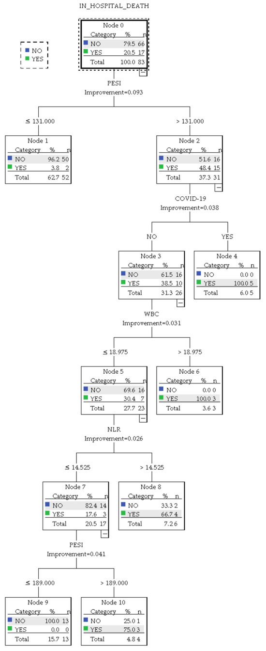 The CART decision tree showed an overall accuracy of 90% (97.3% for predicting survival and 53.8% for predicting in-hospital death). The decision paths in the algorithm distinguished between several patient groups with distinct characteristics regarding the presence of COVID-19 infection, elevated NLR, and particular definitory elements of the PESI/sPESI scores. Notably, the following patient subgroups emerged: