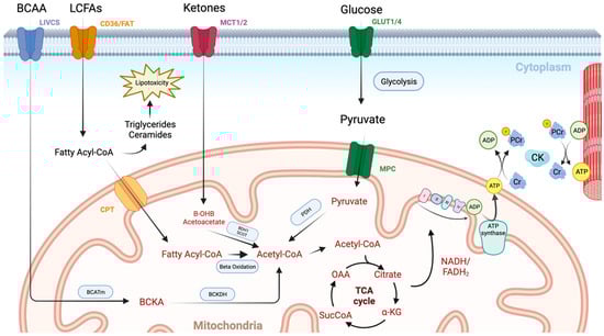 An overview of cardiac metabolism. Long chain fatty acids (LCFAs) enter the myocardium via CD36 and fatty acid transport protein (FAT). They then undergo esterification to form a fatty acyl coenzyme A (Acyl-CoA), which is either converted to lipotoxic intermediates such as triglycerides and ceramides or enters the mitochondrial via the carnitine palmitoyltransferase (CPT) system. Once inside the mitochondrial matrix, the fatty acyl-CoA undergoes beta oxidation with the resulting acetyl-CoA molecule entering the TCA cycle. Glucose enters the cardiomyocyte through glucose transporters (GLUT1/4). It then undergoes glycolysis producing pyruvate, which enters the mitochondria via the mitochondrial pyruvate carrier (MPC). Pyruvate dehydrogenase (PDH) governs the conversion of pyruvate into acetyl-CoA, and thus controls the balance between fatty acid and glucose use via the Randal cycle. Ketones are taken up via monocarboxylate transporters (MCT1/2) and are then converted to acetyl-CoA in the mitochondria by beta hydroxybutyrate dehydrogenase 1 (BDH1) and succinyl-CoA:3 oxoacid-CoA transferase (SCOT). Branched chain amino acids (BCCA) are taken up via the branched-chain amino acid–cation symporter family (LIVCS). Conversion to branched chain ketoacids (BCKA) occurs via the mitochondrial branched-chain aminotransferase (BCATm) before final conversion to acetyl-CoA via branched chain-alpha-ketoacid dehydrogenase (BCKDH). High-energy electron carriers (NADH and FADH2), produced via the tricarboxylic acid (TCA) cycle, deliver electrons to the electron transport chain, where they are used to generate a proton gradient across the inner mitochondrial membrane. ATP synthase then uses this proton-motive force to phosphorylate adenosine diphosphate (ADP) molecules, generating adenosine triphosphate (ATP). Transport of energy to the myofibril then occurs using the creatine kinase (CK) system. Image created using BioRender.com.