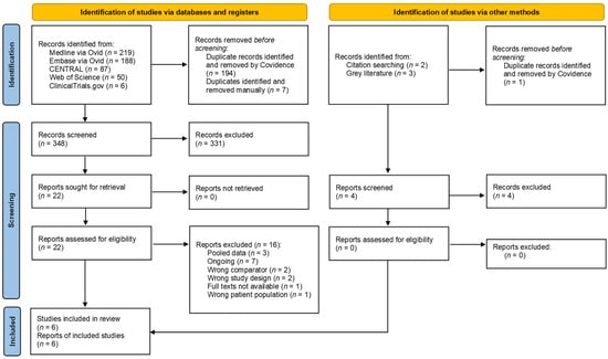 To identify ongoing studies with relevant results for inclusion, six databases were systematically searched, i.e., Medline via Ovid, Embase via Ovid, Cochrane Library CENTRAL, Web of Science, The System for Information on Grey Literature in Europe (Opengrey.eu) (access on 10 November 2023), and ClinicalTrials.gov (access on 10 November 2023). The search protocol adhered to the standard procedures outlined by Higgins et al., 2021 [30]. No restrictions pertaining to time or the type of publication and language were imposed during the initial search. On 10 November 2023, the literature search was carried out using a combination of controlled vocabulary and free keywords (Table A1). A manual search of the bibliographies of all included studies and pertinent systematic reviews was conducted to identify additional reports. The comprehensive search strategy for each database can be found in Table A1.