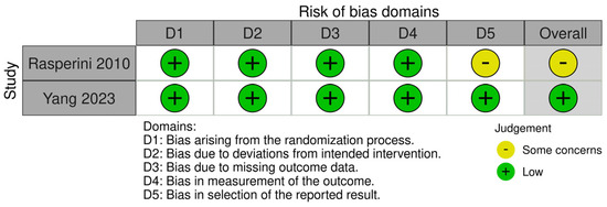 Two RCTs were assessed by the RoB2 tool (Figure 2) and presented with low-to-moderate risk. All RCTs reported on the methods of randomisation and adequate allocation concealment. One study only reported one of the listed outcomes at one of the two measured time points (6-month post-healing) and hence was subjected to reporting bias. Four non-randomised controlled studies were assessed with the ROBINS-I tool and were at low-to-severe risk of bias (Figure 3). One study had a serious risk of bias due to the confounding selection of participants according to the treatment needs of and planning for the patient [33]. Two NCT studies had moderate concerns arising from the bias in the measurement of outcomes [33,41].