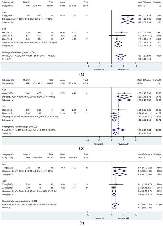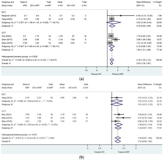 The meta-analysis of RCTs showed a trend towards lesser reduction in mid-buccal ridge height in the ARP group versus the control group while not reaching statistical significance in the random effect model (MD: 3.02; 95% CI: −0.40 to 6.44; p = 0.08; Figure 5a). Sensitivity analysis in the fixed effect model showed statistical significance (MD: 2.30; 95% CI: 0.95 to 3.66, 0.34; p = 0.001). Heterogeneities were not detected (I2 = 36.70%, p = 0.21). When combining RCTs and NCTs, the meta-analysis showed statistically significant and lesser reduction in mid-buccal ridge height in the ARP group versus that of the SH group (MD: 2.18; 95% CI: 1.25 to 3.12; p < 0.001; Figure 5a). Marginal heterogeneity was detected (I2 = 40.20%, p = 0.15; Figure 5a). Meta-regression showed no association of study type (RCT/NCT) with response (p = 0.80).