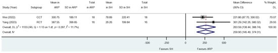 Two studies (one RCT and one NCT) documented alterations in alveolar ridge volume [39,40]. The meta-analysis revealed a statistically significant advantage in the ARP group compared to the control group (MD: 263.59; 95% CI: 138.44 to 388.74; p < 0.001; Figure 6). No heterogeneity was detected (I2 = 11%, p = 0.29).