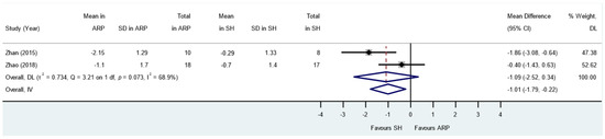 Similarly, the meta-analysis showed statistical significant and lesser reductions in mesial-buccal (MD: 2.08; 95% CI: 1.22 to 2.94; p < 0.001; Figure A2a), mesial-lingual (MD: 0.83; 95% CI: 0.18 to 1.48; p = 0.01; Figure A2b), disto-buccal (MD: 1.64; 95% CI: 0.95 to 2.34; p < 0.001; Figure A2c), and mid-central (MD: 1.99; 95% CI: −0.32 to 3.66; p < 0.001; Figure A2d) ridge heights in the ARP group compared to those of the SH group. No heterogeneity was detected in the above analyses (I2 < 40%, p > 0.10).