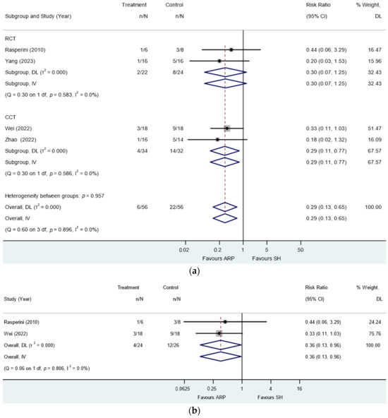 Two of these studies exclusively studied maxillary molar extraction sites [2,40]. In the meta-analysis of the two studies, it was demonstrated that the application of ARP significantly diminished the requirement for additional augmentation during implant insertion in comparison to the SH group (RR: 0.36; 95% CI: 0.13 to 0.96; p = 0.04; Figure 8b). The analysis did not identify any presence of heterogeneity (I2 = 0.00%, p = 0.81).