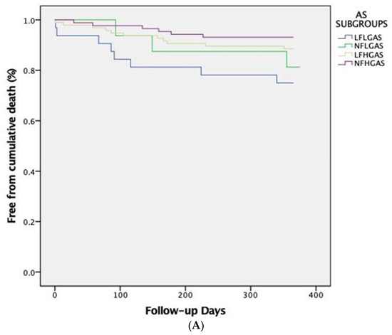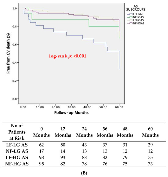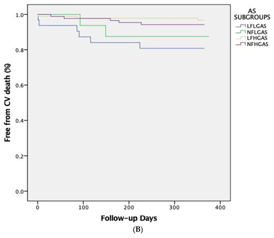 One-year cardiovascular mortality differed significantly between the four subgroups of AS patients (p = 0.018), which was driven primarily by the significantly higher cardiovascular mortality of LF-LG compared to LF-HG patients (19.3% vs. 3.1%, respectively, p = 0.008). At 5-year follow-up, cardiovascular mortality was significantly higher in LF-LG patients (53.2%), compared to LF-HG (21.4%, p = 0.001) and NF-HG patients (17.9%, p = 0.001) but not compared to NF-LG patients (23.5%, p = 0.075). The Kaplan-Meier curves for global and cardiovascular mortality at 1-year and 5-year follow-ups are shown in Figure 1A,B and Figure 2A,B, respectively.