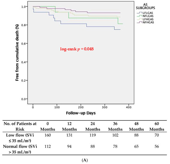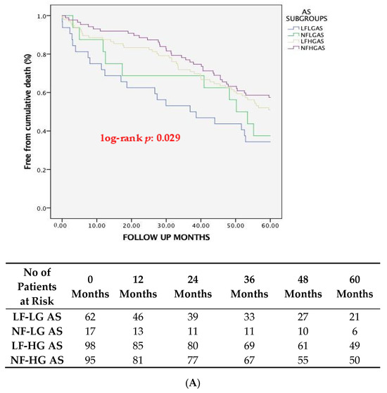 The one-year clinical outcomes are shown in Table 4. One-year all-cause mortality was significantly higher in LF-LG patients compared to NF-HG patients (25.8% vs. 6.3%, respectively, p = 0.011) but not compared to NF-LG (25.8% vs. 18.8%, respectively, p = 0.729) or LF-HG patients (25.8% vs. 11.5%, respectively, p = 0.084) (Table 4). The median follow-up duration was 59 months (IQR: 31 to 81 months) and the late cumulative clinical outcomes are shown in Table 4. A total of 137 patients died at five-year follow-up, leading to a global cumulative mortality of 50.36%. Death was from cardiovascular causes in 75 patients (27.57%). Five-year all-cause mortality was significantly higher in LF-LG patients compared to NF-HG patients (64.5% vs. 42.5%, respectively, p = 0.038) but not compared to NF-LG patients (64.5% vs. 58.8%, respectively, p = 1.00) and LF-HG patients (64.5% vs. 47.9%, respectively, p = 0.152). This was confirmed by the multivariable Cox proportional hazard regression analysis, where the presence of LF-LG AS was independently associated with increased late all-cause mortality (HR: 1.757, p = 0.018) with NF-HG AS being the reference standard.