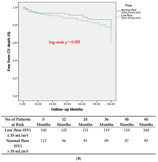 Patients who exhibited low flow pre-procedurally by means of the Doppler-based estimation of SVi had increased 5-year all-cause and cardiovascular mortality compared to patients with normal flow, which is depicted in the respective Kaplan-Meier survival curves (Figure 3A,B, respectively). This was confirmed in the multivariable Cox proportional hazard regression analysis, where SVi emerged as a significant independent predictor of late global mortality after TAVI (HR:0.951 per unit increase of SVi, p = 0.004) (Table 6).