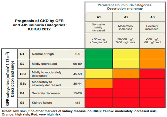 - Levey, A.S.; Becker, C.; Inker, L.A. Glomerular filtration rate and albuminuria for detection and staging of acute and chronic kidney disease in adults: A systematic review. JAMA 2015, 313, 837–846. [Google Scholar] [CrossRef]
