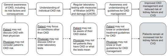 Multiple barriers to optimal CKD care exist (Figure 3), including low awareness of patients and clinicians of the risk factors and complications of CKD, as well as patient denial or limited involvement in their disease. In some cases, there may be suboptimal clinician knowledge to confirm the CKD diagnosis and conduct appropriate monitoring of CKD (e.g., low use of screening labs, such as serum creatinine at regular intervals; only 1 in 5 patients have adequate uACR monitoring). This lack of knowledge can hinder the diagnosis of early CKD, as well as an appropriate risk stratification of patients. Other barriers include the limited involvement of primary care in management of CKD, a lack of proper nephrology consults based on target GFR and lack of clinician- or patient-targeted evidence-based interventions to reduce CKD progression or CVD, the existence of few partnerships between a clinician and patient, and insufficient tools for utilizing electronic health records (EHRs) [11,12,67,68,69].