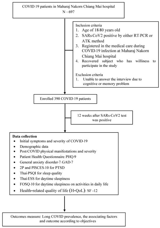 The Research Ethics Committee, Faculty of Medicine, Chiang Mai University, approved this prospective observational study (Study code: MED-2564-08702, date of approval: 3 February 2022). We confirm that this research was performed in accordance with the relevant Declaration of Helsinki guidelines/regulations. Informed consent was acquired from all participants. This study was conducted on subjects with positive COVID-19 Antigen Test Kits (ATK) or reverse transcription-Polymerase Chain Reaction (RT-PCR) tests from January–April 2022 in Maharaj Nakorn Chiang Mai Hospital—Faculty of Medicine, Chiang Mai University. Subjects who met the inclusion criteria were invited to participate. Sample size was determined using the applied Taro Yamane Formula, allowing a 5% margin of error to reflect the population affected by long COVID. In total, 390 subjects who committed with informed consent were traced back to their medical records of symptoms at their positive test date and interviewed telephonically to collect information about long-COVID-19 manifestations. The phone interviews started three months after the day of diagnosis and continued every quarter for a year. The questionnaire was divided into four parts: demographic data, post-COVID physical manifestations, post-COVID mental effects, and sleep effects.