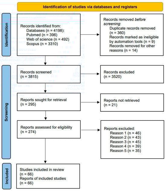 Based on the specified search terms, we identified 4198 records from the databases as follows: Pubmed (396), Web of Science (492), and Scopus (3310). After applying automated screening conditions and the inclusion criteria, 66 studies were shortlisted for review. Please refer to Figure 1 for the specific screening process.