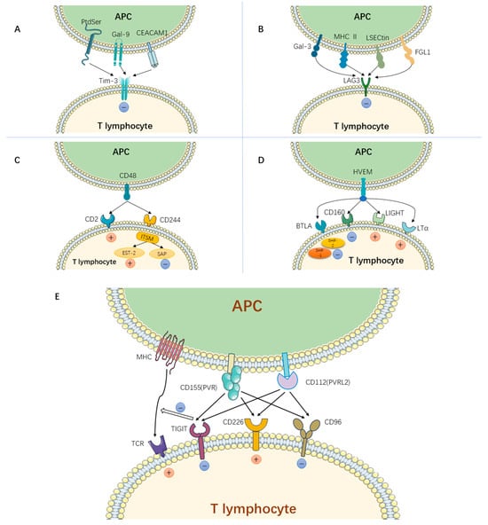 Panel (A): Suppressor receptor Tim-3 and its ligand transmit inhibitory signals upon binding; Panel (B): Suppressor receptor LAG3 and its ligand transmit signals that inhibit T lymphocyte activation upon binding; Panel (C): CD244 binds to its ligand CD48, which is based on the immunoreceptor tyrosine switch motif (ITSM) that transmits stimulatory signals when bound to EST-2 and inhibitory signals when bound to SAP, and CD48 transmits stimulatory signals to T lymphocytes when bound to CD2, thus making CD48 a bidirectional switch; Panel (D): In the CD160/BTLA/LIGHT/LTα/HVEM signaling complex, HVEM transmits inhibitory signals when bound to BTLA or CD160, and HVEM transmits inhibitory signals when bound to LIGHT or LTα. Panel (E): TIGIT competitively binds CD155 and CD112 with CD226 and transmits inhibitory cell signaling. Also binding to CD155 and CD112 and then transmitting inhibitory signaling is CD96, but TIGIT is dominant among them. In addition to transmitting inhibitory signaling on its own, TIGIT also directly inhibits the TCR signaling pathway. (Created with https://smart.servier.com/, accessed on 12 June 2023).